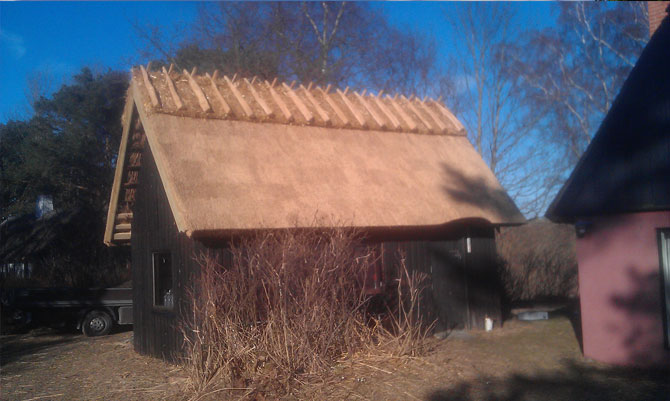 Nyt stråtag-projekt i Tibirke: Installation af et nyt stråtag med Sepatec brandsikring på dette smukke udhus, dækkende et samlet areal på 46 kvadratmeter.